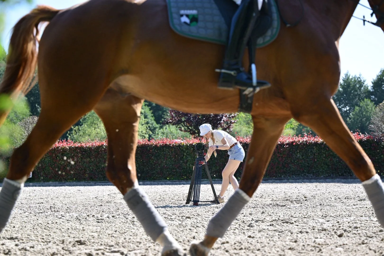Eine Frau filmt ein Pferd auf einer Reitbahn an einem sonnigen Tag.