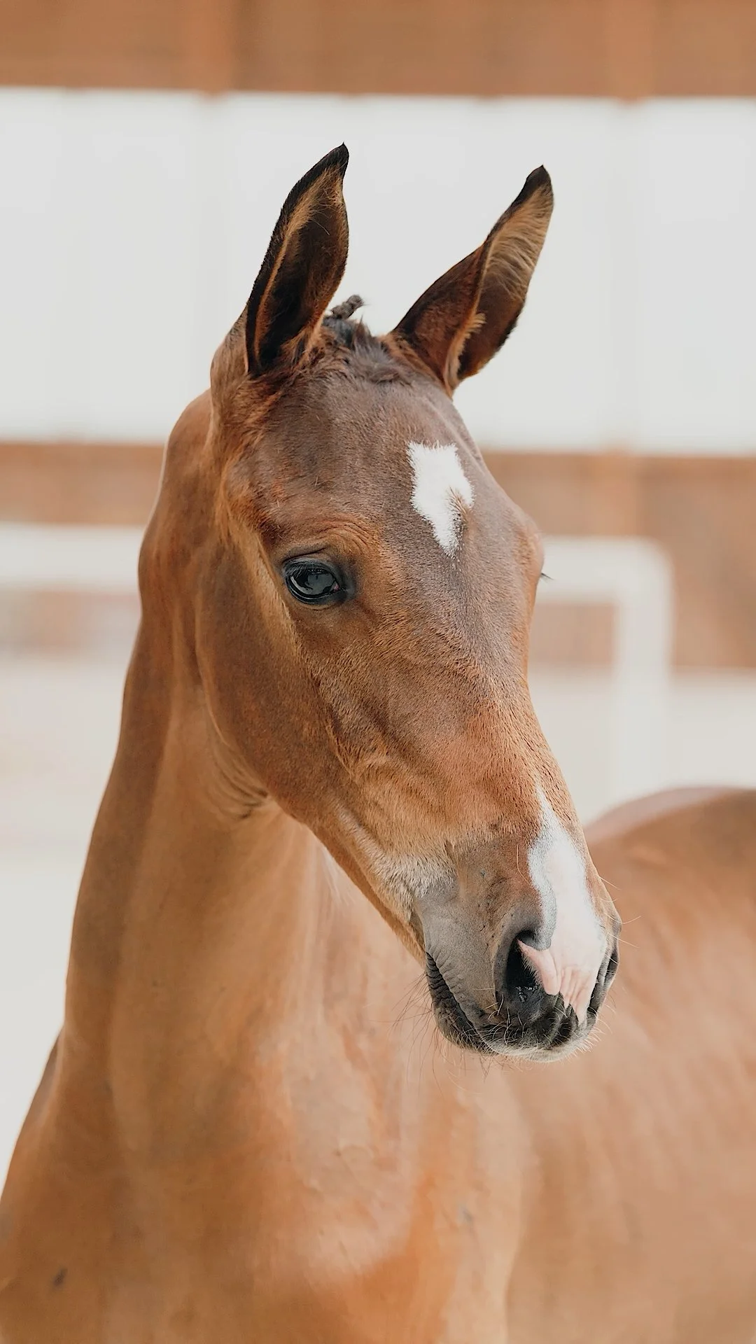 Ein Braunes Fohlen mit weißen Abzeichen im Gesicht, Blick nach links, im Stall